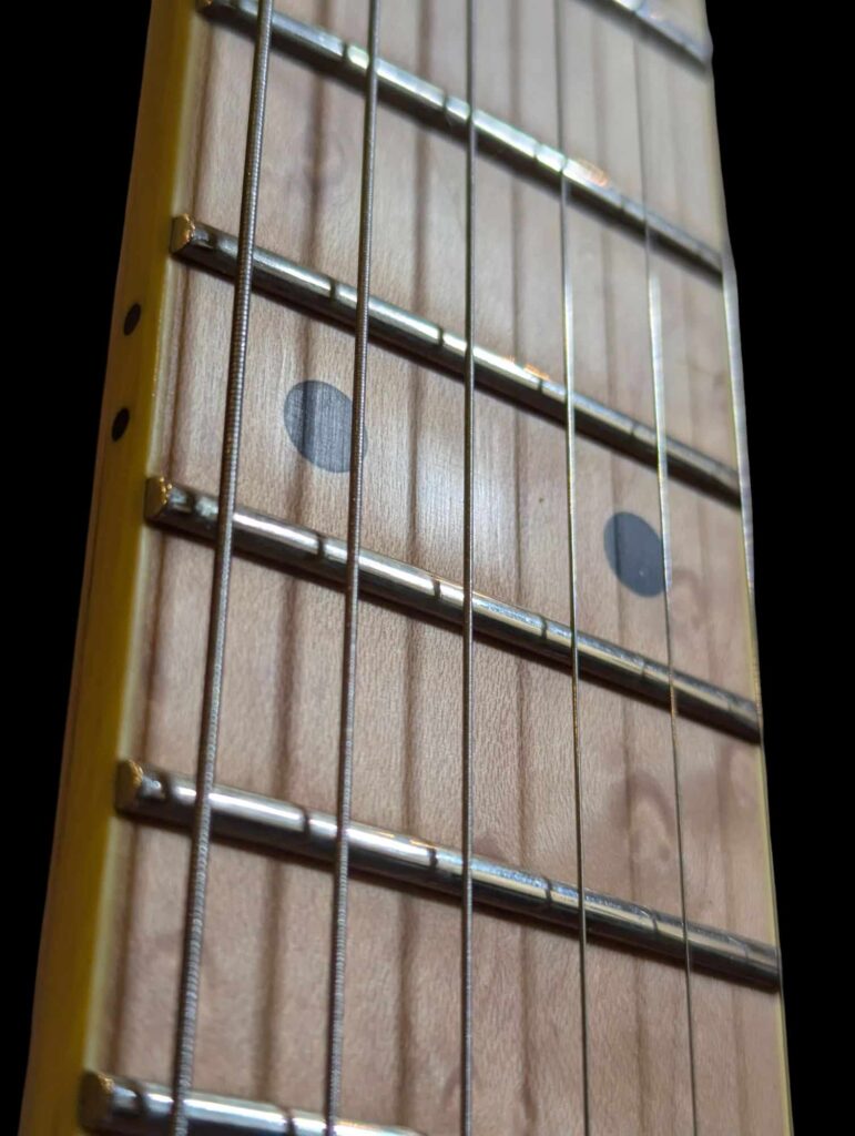 Została perfekcyjnie wysetupowana w Hammer-on, co oznacza maksymalny komfort gry – niska akcja strun, doskonała intonacja i płynność na całej długości gryfu. Progi są idealnie wyszlifowane, a podstrunnica klonowa daje znakomitą responsywność i jasne brzmienie.
