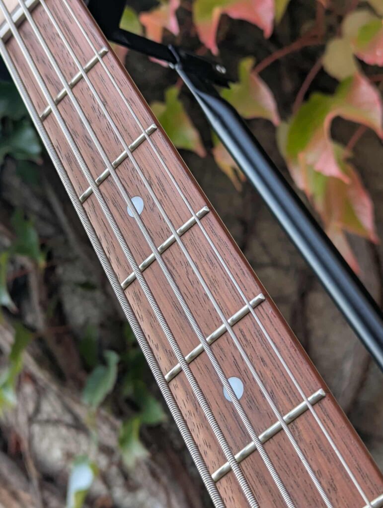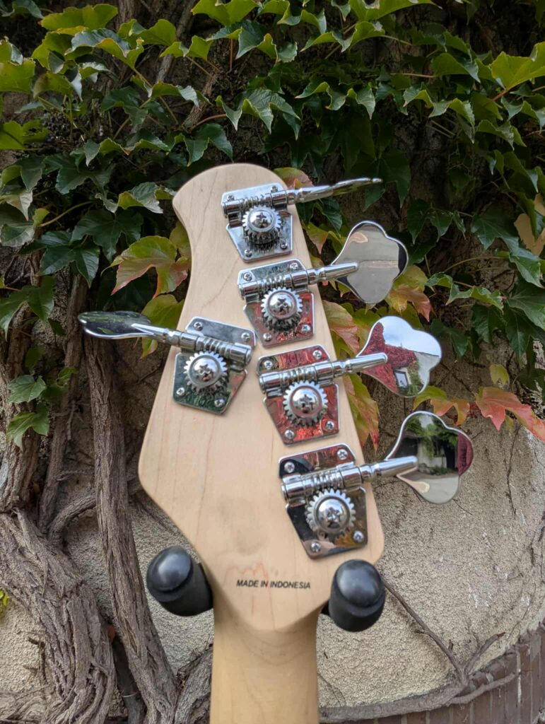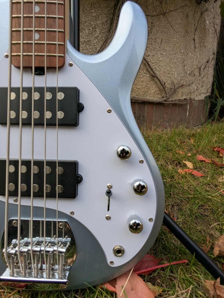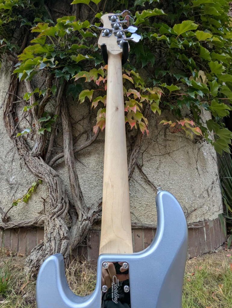 Korpus z drewna poplar, gryf klonowy z satynowym wykończeniem, podstrunnica z jatoby. Menzura 34”, 22 progi, profil gryfu wygodny i szybki – instrument dobrze leży w dłoni mimo pięciostrunowej konstrukcji.